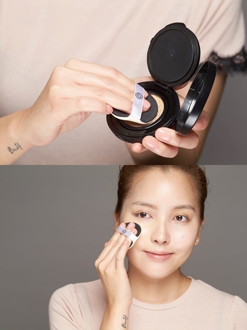 選擇這一款是遮瑕力極佳的氣墊粉餅,直接使用內附的海綿,沾取約海綿1/3的量即可,從兩頰較大範圍的部位先輕輕拍上,如果粉底不夠可以再沾取一次,再帶到額頭以及下巴等處。