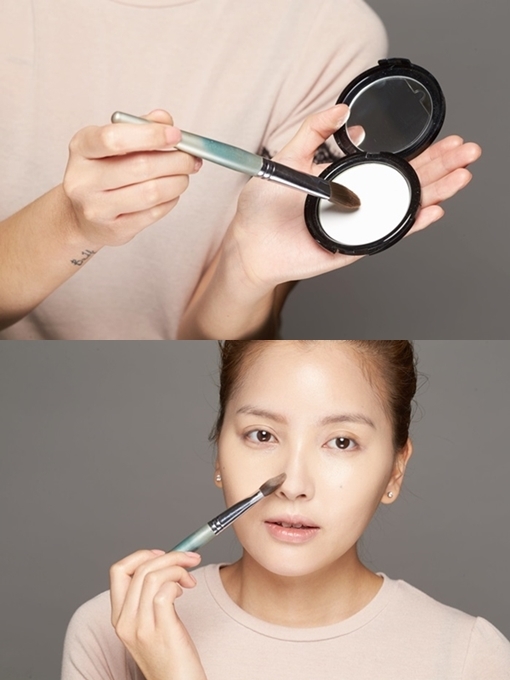 最後定妝步驟要特別注意,為了不影響氣墊粉餅完妝後的光澤感,建議選用透明感的蜜粉,使用蜜粉刷沾取適量後,只需要輕刷於鼻頭部位即可,這樣就能抑制鼻子容易泛油光的現象。