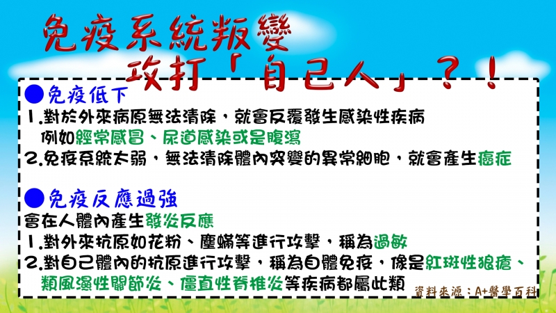 醫藥記者洪素卿表示,免疫系統生病大致分為兩大類,一是免疫反應太強,另一則是免疫低下。