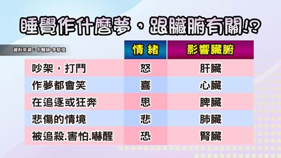 五志(情緒情志)對應五臟。怒對應肝、喜對應心、憂對應肺、思對應脾、恐對應腎。當白天一種情志太過,會反映在夢裡。同樣也可以藉由夢,觀察五臟是不是出問題。