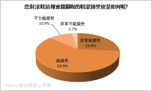 穿涼鞋露出腳趾對你來說接受度如何?市調結果顯示,26.6%非常能接受、59.9%能接受;10.9%不太能接受、2.7%非常不能接受。超過8成民眾能接受的結果顯示,涼鞋果然是民眾夏日裡最獲青睞的鞋款!夏日天氣不是悶熱、就是午後易有陣雨,如果可以穿上涼鞋,在功能性方面著實讓腳部涼爽許多,有了功能性的選擇,再加上現在涼鞋款式越做越美,讓涼鞋不只是為了涼而穿,而是為了穿美美,在夏日搭配上有加分效果。