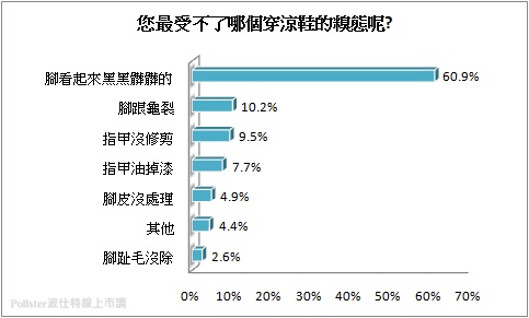 穿涼鞋有了高接受度,代表街頭可想而見的普及率,這麼多人愛穿涼鞋,但總有些NG糗態,市調結果顯示,60.9%認為「腳看起來黑黑髒髒」為最受不了糗態、其次是腳跟龜裂占10.2%、指甲沒修剪占9.5%、指甲油掉漆占7.7%、腳皮沒處理占4.9%、其他占4.4%、腳趾毛沒處理占2.6%。可見穿涼鞋,注重整體觀,不管是自己或看到別人,最怕的就是看到腳表現的不夠乾淨,顯得很糗!其餘腳跟龜裂、指甲沒修、指甲掉漆、腳皮沒處理等等都只是其中細究項目,而其加總才是令人害怕的NG糗態。