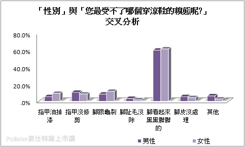 而在男女生看穿涼鞋,最受不了的糗態,分析結果不分男女皆害怕看到髒髒黑黑的腳,除此之外,在男女生分別最在意的穿涼鞋,男性在意指甲沒修剪、女性則最害怕的是指甲油掉漆。