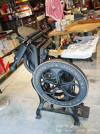 門口復古的印刷機上有可愛的印章可以蓋