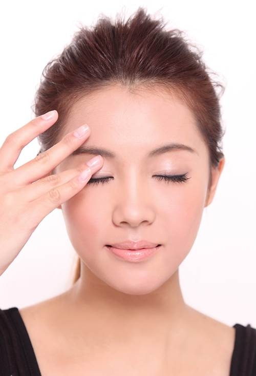 - 在無名指指腹沾眼霜,從眼頭上方的地方開始,慢慢以提拉的手勢滑向眼窩;