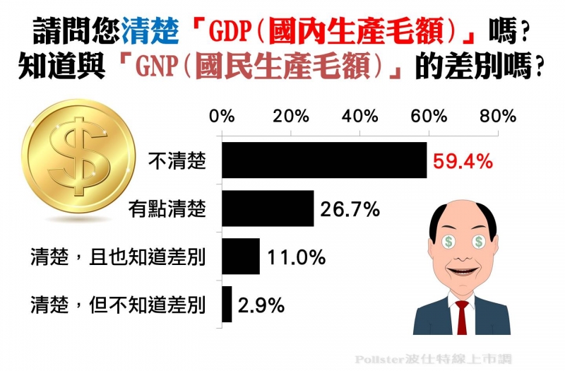 Pollster波仕特線上市調網詢問「請問您清楚『GDP(國內生產毛額) 』嗎?知道與『GNP(國民生產毛額) 』的差別嗎?」。調查結果顯示,近六成(59.4%)受訪者不清楚「GDP(國內生產毛額)」,占整體比例最高,其次依序為「有點清楚」占26.7%、「清楚,且也知道差別」占11.0%與「清楚,但不知道差別」占2.9%。根據上述結果,僅有13.9%受訪者清楚GDP(國內生產毛額)意思,而將近六成受訪者不清楚。