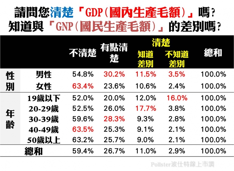 綜合以上結果,近六成(59.4%)受訪者不清楚「GDP(國內生產毛額)」,相對而言,清楚「GDP(國內生產毛額)」且知道與「GNP(國民生產毛額)」的差別之比例以「男性」或年齡層在「20-29歲」相對較高。