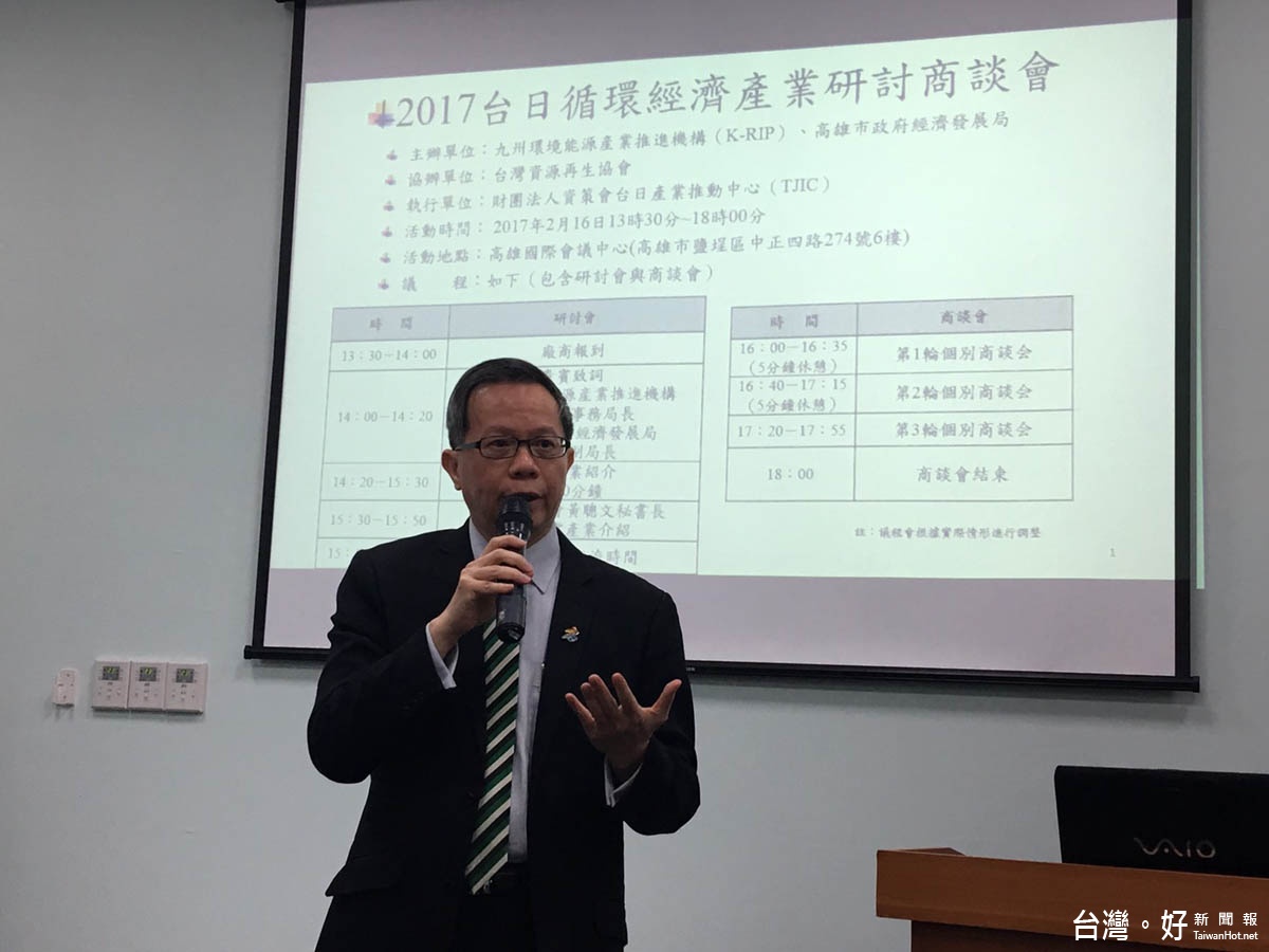 高雄為南台灣的海空雙港城市,過去因中鋼、中油等材料上游端的帶動,鋼鐵與石化成為我們的優勢產業,然而重工業的快速崛起成就了經濟的快速成長,但也面臨了環境破壞的代價,九州過去曾面臨公害問題,其後致力克服汙染,結合產學官方組織與民間的力量,一起互相合作對抗環境汙染及公害,累計許多珍貴的技術與經驗,市府也正規劃綠色材料循環園區,欲整合臨海工業區與鄰近工業區等區域能資源並促進地方經濟發展之用,期盼藉由此次一對一台日企業的商談媒合會,除增進台日企業產業技術交流,未來可結合九州K-RIP對於環境產業之強項,共同推動高雄產業朝向永續環保方向發展