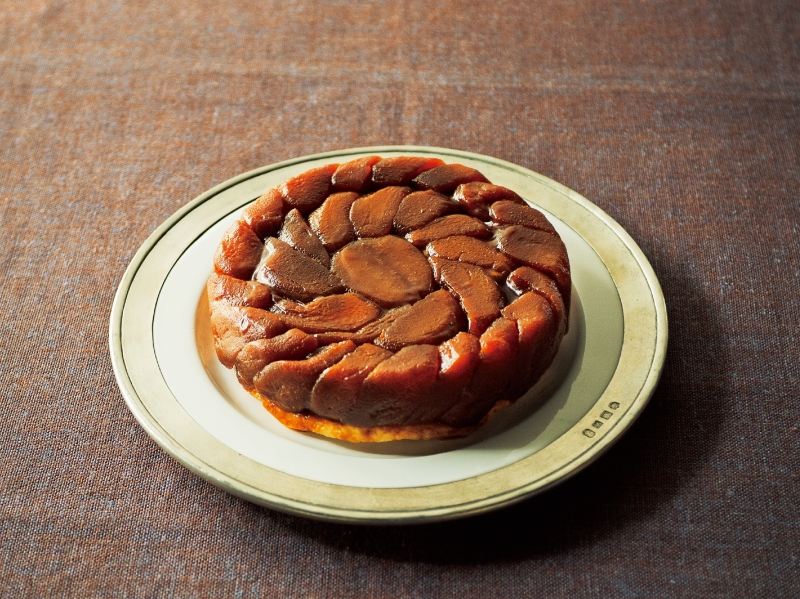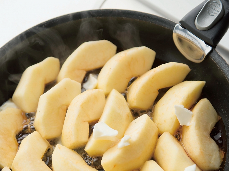 四、蘋果削皮、去掉芯和籽,切成6∼8等分。將細砂糖150g與水50㎖倒入平底鍋,用中火加熱到砂糖變焦糖色後,再將一半分量的蘋果整齊排進鍋中。接著把奶油20g切碎後加入。