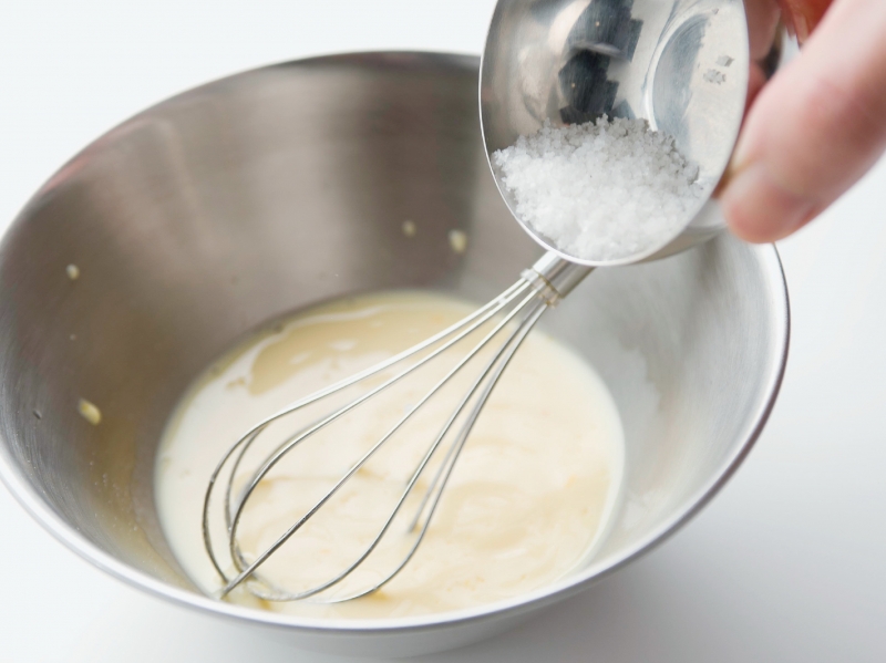 一、製作派皮麵團。將牛奶、蛋黃、細砂糖、鹽倒入缽盆拌勻,放進冰箱冷藏。