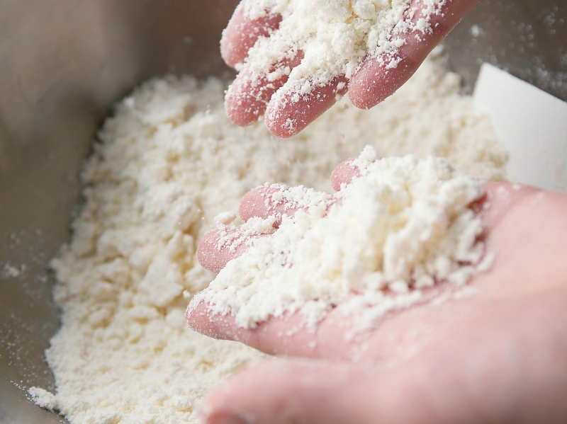 二、將低筋麵粉過篩進另一個缽盆,再加入奶油,用刮刀以切拌方式使奶油融入麵粉。一邊用手揉碎奶油,一邊搓揉、混拌奶油與低筋麵粉,使其變成如麵包粉的樣子。