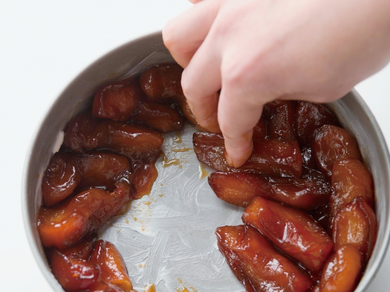 七、塗抹奶油10g( 分量外)在烤模內側,再將蘋果沿著邊緣往中心方向排列。