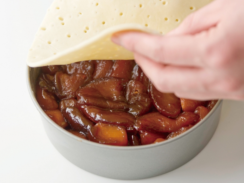八、把約一半分量的派皮麵團擀成烤模的大小、2∼3㎜的厚度,蓋在蘋果的上面。
