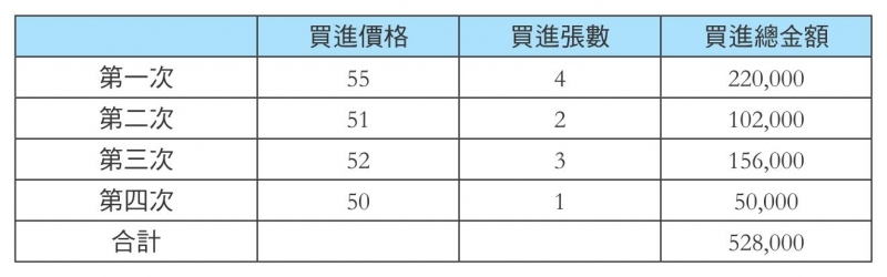 假設你看好A股票,第一次用55 元買進4 張。不料歐債危機又來攪局,歐美股市連續重挫,股價回到51 元,你覺得該是逢低攤平的時候,就再買2 張。果然,股價慢慢反彈到52 元,你非常看好它的續航力,所以再買3 張。但是,一買就跌,是很多投資人共同的心聲,又跌到50 元整數關卡,你想再買,但不敢買太多,結果只買1 張。我把它用下面的圖表做彙整,有利於你對這個例子的理解,才能進行下面的計算: