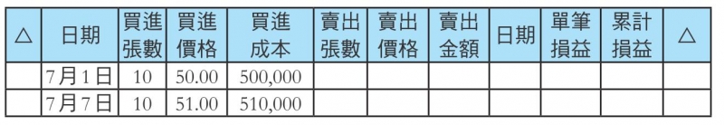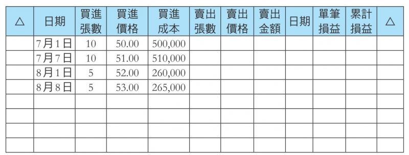 假設你一開始依照第五章的方法,分四次陸續買進「台灣50」,第一筆7 月1 日,用50 元買進10 張,第二筆7 月7 日,用51 元也買進10 張,第三筆8 月1日,用52 元再買進5 張,最後一筆8 月8 日則是用53 元又買了5 張。請你就用以下的方法,將這幾筆記在帳本上,下表。以下舉例提到的日期,未考慮是否為假日或休市期間,同時為簡單起見,手續費和證交稅也暫不予計算,但實務上,正確的買進成本請依照證券公司提供的對帳單。
