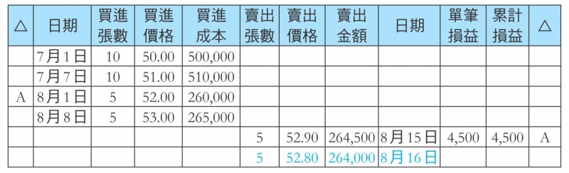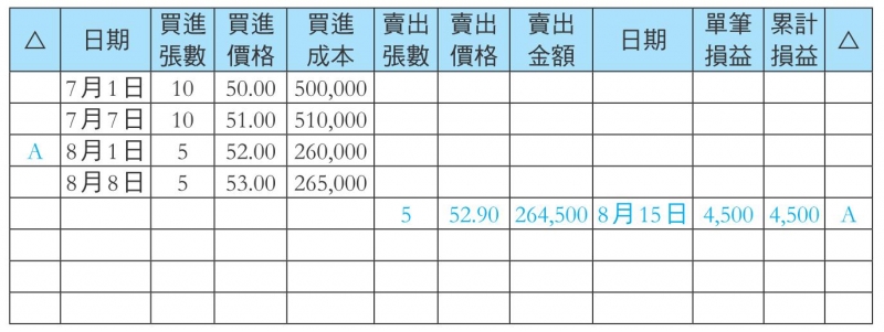「△」和右邊的「日期」欄終於有作用了。請在第3 筆8 月1 日最左邊的「△」欄內寫一個A,並同時在賣出這一筆8 月15日的最右邊的「△」欄內也寫上一個A,表示這一筆的損益是用這兩筆算出來的。賣出金額264,500 元減買進成本260,000 元,賺了4,500 元,所以「單筆損益」欄內就可以記入4,500 元。