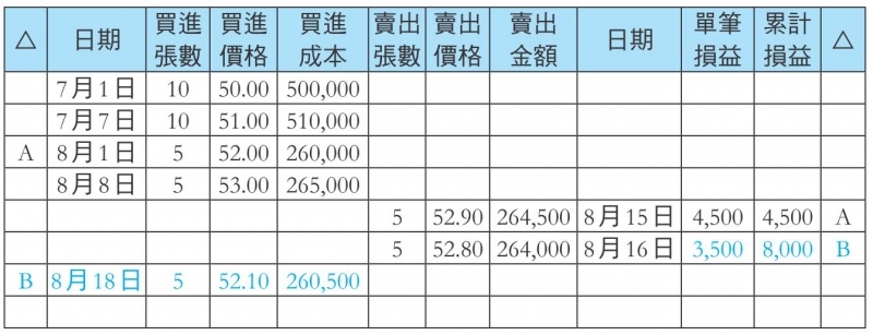 這一次,你在8 月16 日和8 月18 日這兩筆的「△」欄內,各寫上一個B,代表要用這兩筆來計算損益。「先」賣出的金額264,000 元,減掉「後」買進的成本260,500 元,賺了3,500 元,所以「單筆損益」欄內就可以記入3,500 元。因為你在8 月15 日已經賺了一次,這是第二次了,所以你可以把這一次賺的3,500元,加上上一次的4,500 元,累計獲利8,000 元,計在「累計損益」欄內。