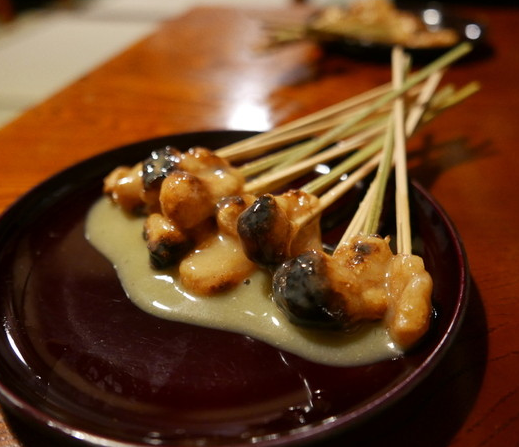 串起沾滿黃豆粉的麻糬並用炭火燒烤,最後再塗上白味增醬。