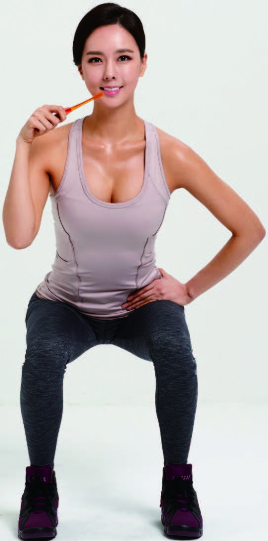 這是深蹲的變形一部曲!先做深蹲動作,以坐著的姿勢搭配節奏,讓臀部上下搖擺,就是彈起深蹲。這個動作要做3 回,一回15 ∼20 次。