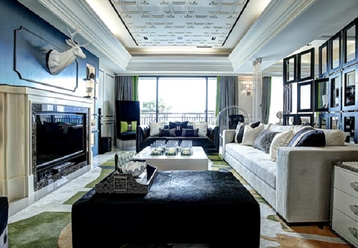透過黑白基調的鋪陳打底,整座客廳的空間語彙,在秩序的紋理中,流動著輕柔且沉穩的黑色力量。為了讓賢給散發在這股空間之中的自由表情,設計師只沾取少許明色系來增添空間色彩,利用鮮綠、亮銀的點綴參與,使這個賓客雲集的場域,除了有窗外天光滲透進大片透明窗戶的溫柔相伴,上繁下簡的線條更收束了整體視覺,滿足屋主傾慕「低調奢華」的心性。溫柔絨毛地毯、緞布抱枕、窗簾等物件的精心選用,也彷彿在豐盛奢華的氣氛裡,透露出屋主在住宅之中渴望獲得「安居樂業」生活的企盼目光。