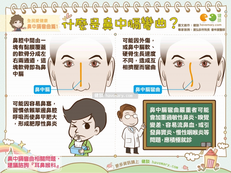 曾梓展醫師表示,鼻中膈彎曲是很常見的問題,但大部分人的症狀輕微,並不會對正常呼吸造成影響;若嚴重者可能會使過敏性鼻炎加重、嗅覺變差,並容易引發流鼻血、鼻竇炎、慢性咽喉炎等,建議積極就診以改善不適。