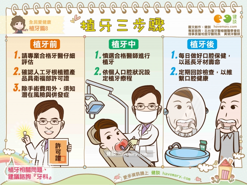 1. 慎選接受過人工植牙專業訓練之合格醫師進行手術,以免因技術不足導致植牙失敗或衍生其他感染與併發症。