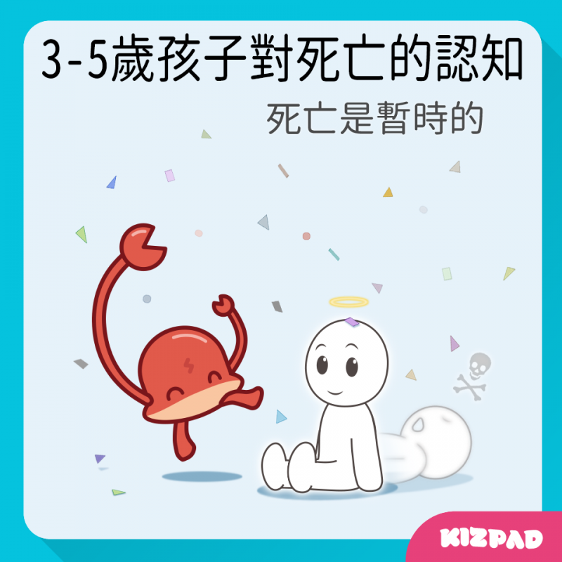 這個年紀的孩子,對死亡很難理解,他們會認為死亡只是暫時離開,不是長久的。孩子可能會有許多的幻想,但多數幻想都是偏於死亡是可以復活的,是可以回來的。