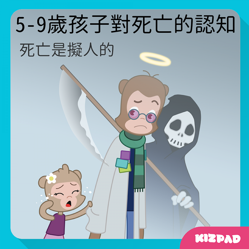 這個年紀的孩子是把死亡擬人化,他們會認為死亡是被死神抓走才會死,他們會不希望自己或自己在乎的人死,而他們也認為死亡不是經常發生的,所以死亡是一件神奇的事情。