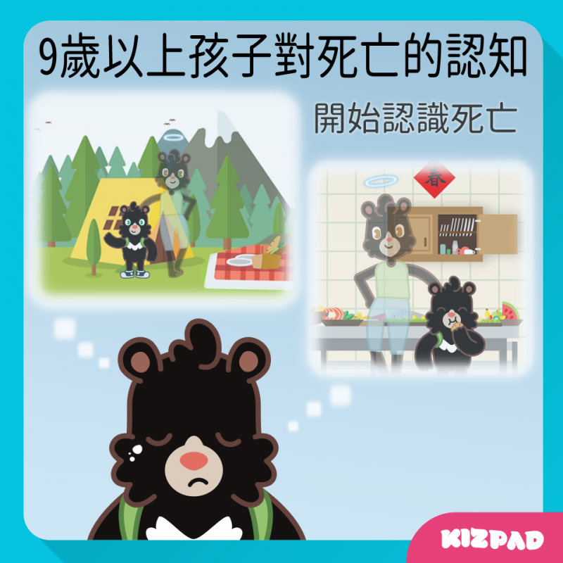 這個年紀以上的孩子開始知道死亡是真實的、是不可避免的,每個人都會面對死亡,而死亡是不會再回來的,會開始慢慢理解死亡的真實意義。