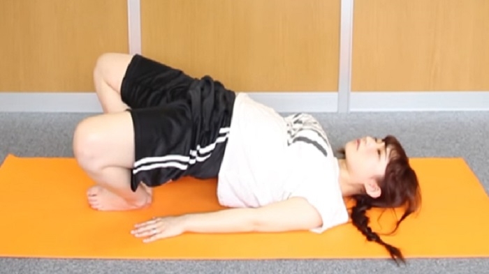 首先做個預備動作~將身體仰躺,並將兩隻腳的內側貼合,盡可能把膝蓋靠近地板(是不是跟平常起不來的姿勢一模一樣!)