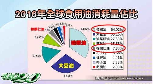 根據2016年統計顯示,棕櫚油是全球消耗最多的食用油,棕櫚油又名棕油,雖然被歸類為植物油,其實它就像是牛油、豬油等動物油脂一樣,含有飽和脂肪,棕櫚油的飽和脂肪佔高達50%,攝取過多也可能會導致心血管疾病。