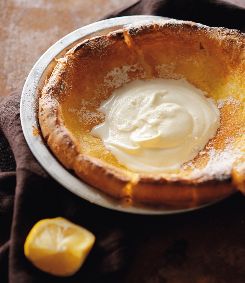 5 趁熱擠入檸檬汁並篩撒上糖粉,再將鮮奶油與砂糖打發成7 分的鮮奶油霜,並放入鬆餅中即可。(淋上楓糖漿也非常美味。)