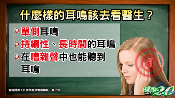 - 持續性、長時間的耳鳴:連續一週以上,而且整天持續不間斷的耳鳴,就需要就醫評估是什麼原因造成的。