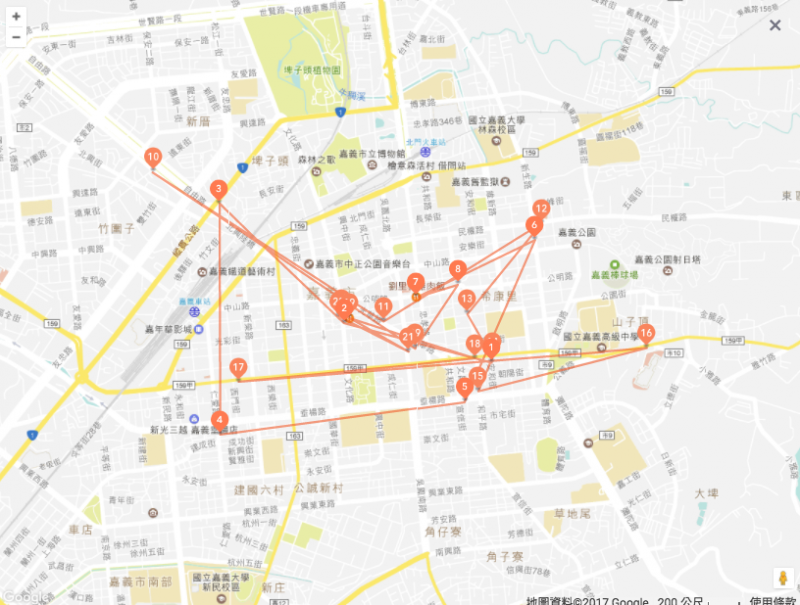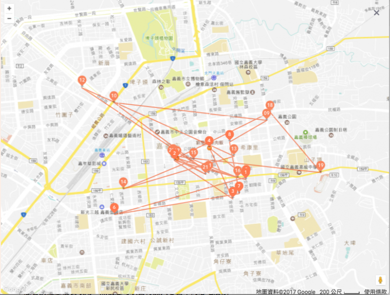 朋友轉發了綠豆嘉義人製作的狂吃火雞肉飯行程。由於我們對嘉義市街道的認知近乎於零,因此我們決定將這22個店家位置與時間可視化。