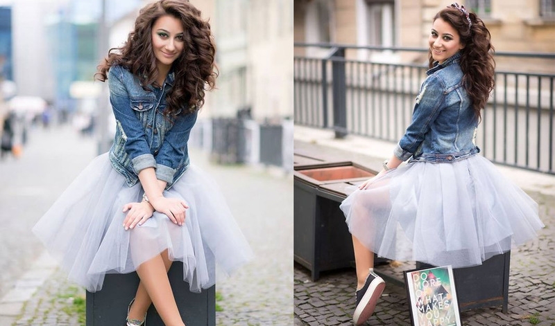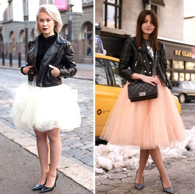 以黑色調的衣服將紗裙搭配得很有個性,黑色皮衣加上紗裙呈現帥氣女孩風,再戴上墨鏡展現不凡氣勢。