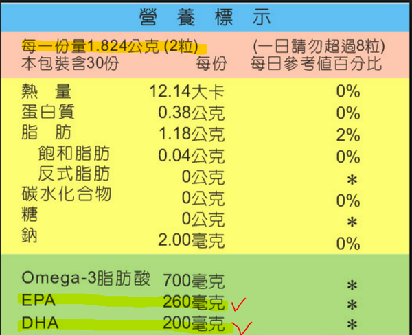 PS:若媽咪是攝取魚油部份,請注意裡面的EPA及DHA的劑量唷~營養師建議每日1000mg(EAP+DHA比例:3:2)。例如以下圖表為示範圖: