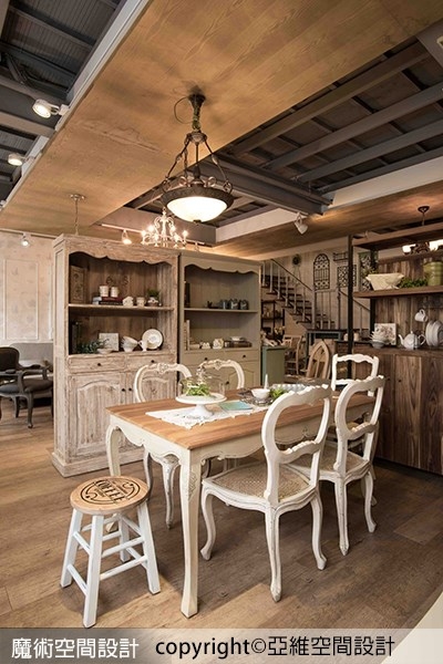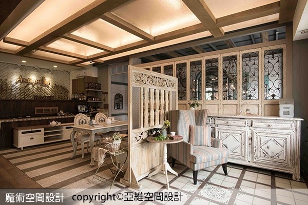 這個得獎作品是一個特別的複合式空間,200坪兩層樓的建物,一樓規劃為家具陳列展場及咖啡廳,二樓為室內設計中心及布藝織品展示區,透過法式鄉村風格的細膩佈置堆疊,串聯上下、內外整體設計感,呈顯「亞維空間設計X安堤卡家居X安堤卡咖啡」的豐美內涵與專業態度。