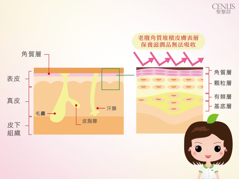 皮膚構造由內而外分為表皮層、真皮層、以及皮下組織,表皮層中最外層的就是角質層,主要由15至20層沒有細胞核的死亡細胞組成。