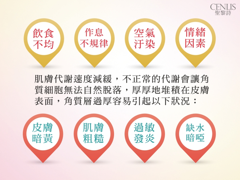 我們每天經受著飲食不均衡、生活作息不規律、空氣污染、情緒等因素的不良影響,使得肌膚代謝速度減緩,不正常的代謝會讓角質細胞無法自然脫落,厚厚地堆積在皮膚表面,角質層過厚皮膚會發黃,出現皮膚粗糙、暗啞的情況,皮膚的水分也容易流失。假如不當去角質反而會造成缺水、過敏和發炎等現象。