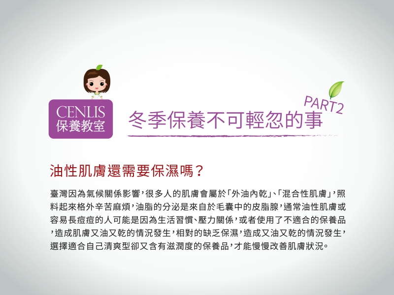你也是屬於外油內乾的肌膚嗎?通常這樣的肌膚照料起來真讓人傷腦筋(小編舉手默認中),除了平常要留意作息與飲食之外,有時候不小心冒痘,照顧格外要注意,尤其偶爾嘴饞想來點炸類的,叮咚~隔天臉上必定會冒痘!但是,油性肌膚的人就不需要做保濕嗎?這個想法可是大錯特錯~油性肌膚的人,更應該要做保濕!讓肌膚達到油水平衡,肌膚的保濕度以及彈力才能維持穩定