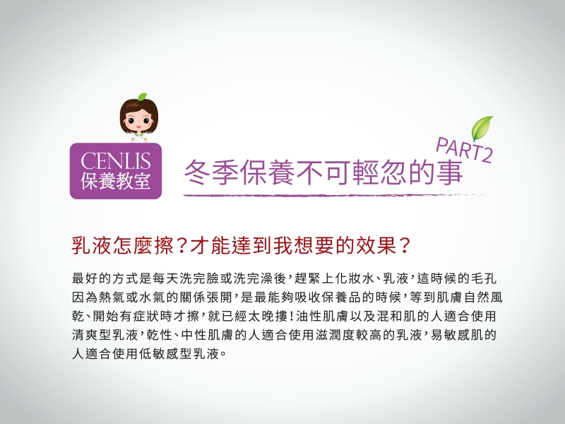肌膚的保濕工作,從來都不簡單,想要找到適合自己的乳液,可以先試用一點點的乳液擦在臉頰上,如果當你感覺到悶感不適,就表示你所選的乳液是不適合自己的肌膚。