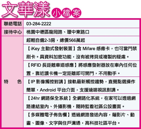 「文華漾」也主打五大時尚科技訴求,以人性化尖端科技,迎向智慧建築新時代,包括RFIDMifare感應式iKey系統,車道、電梯、門禁一卡通行,同時享受極致尊榮和便利安全,傲視全區的時尚先進家居。