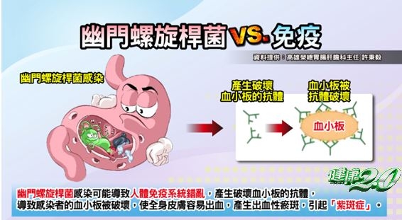 幽門螺旋桿菌是一種非常奇特的細菌,可以長期生活在胃酸這種pH值為2的強酸環境裡,分泌多種毒素和酵素,破壞人類胃黏膜的表皮細胞,使胃酸分泌量增加,導致胃炎或潰瘍的產生。研究顯示:受幽門螺旋桿菌感染的人100%會產生慢性胃炎,20%會產生胃潰瘍或十二指腸潰瘍,同時有0.5~1%的病患,最後會導致胃癌。此外,幽門桿菌還可能引起高血壓、心臟病、糖尿病、腎病變、蕁麻疹、紫斑症、失智、淋巴癌等問題。