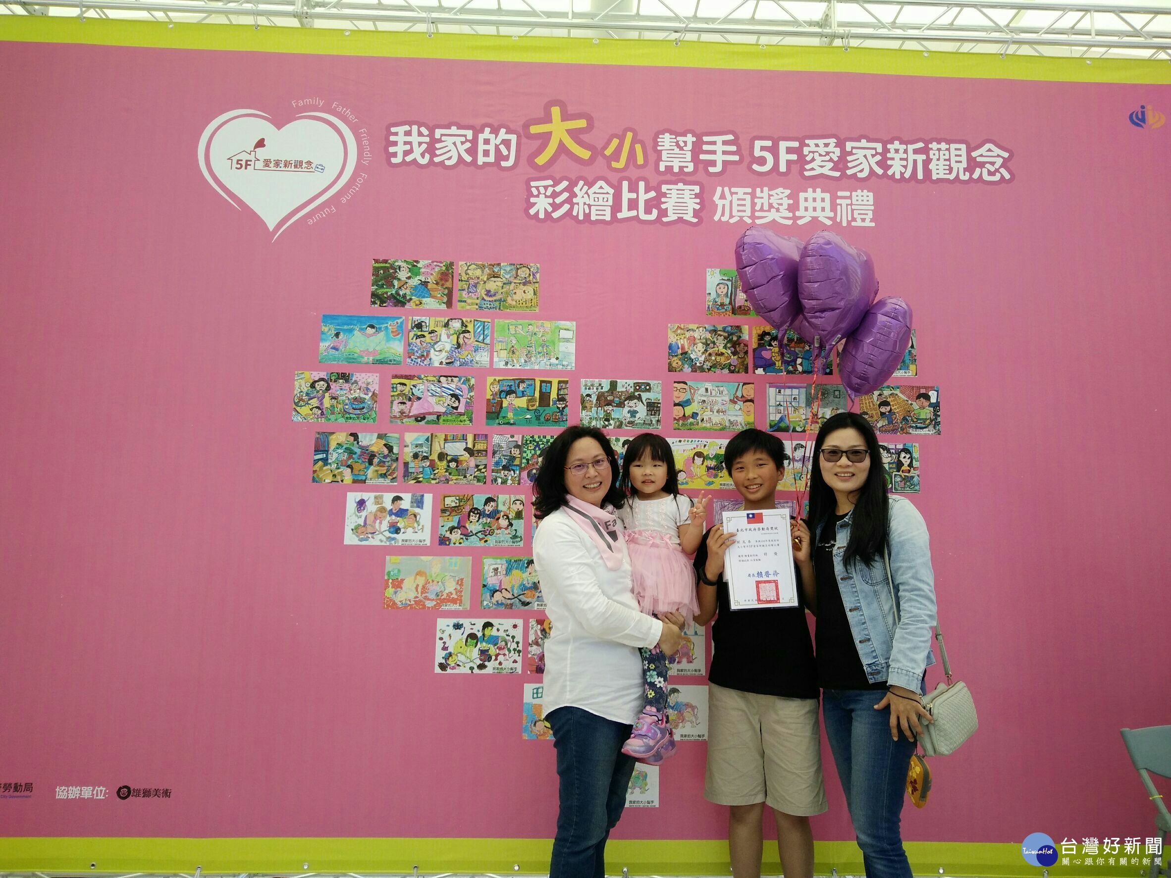 台北市政府勞動局主辦的「我家的大小幫手 5F愛家新觀念彩繪比賽」頒獎典禮,於 29日,台北市立兒童新樂園舉行,邀請獲選小朋友及親友一起上台受獎,同時在園區二樓展出42件得獎作品,超過130人出席頒獎典禮,選多得獎家庭都是全家一起出席分享得獎者喜悅,現場氣氛溫馨熱烈。