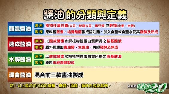 《健康2.0》來賓生機飲食專家王明勇表示,只要加了鹽酸,就是所謂的「化學醬油」。製作醬油的關鍵,是透過發酵過程,讓蛋白質產生胺基酸,因此各種富含蛋白質的原料都可以製作醬油,如:頭髮、動物毛皮、皮鞋等等。過去大陸有傳出所謂的頭髮醬油、皮鞋醬油,就是有黑心廠商貪圖便宜,回收廢棄頭髮後,以化學水解方式製作胺基酸液配製醬油。