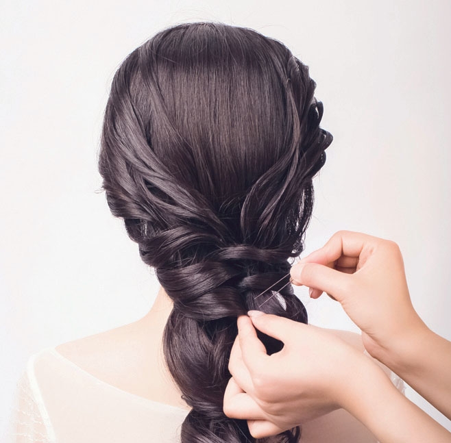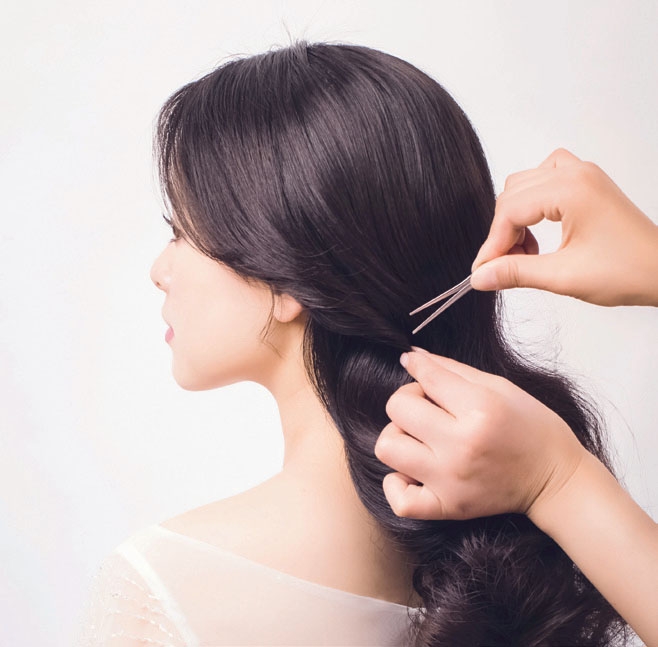 檢查整體髮型,並將碎髮整理乾淨。配戴選定的飾品,完成髮型。