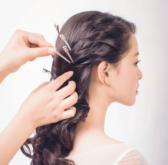 將擰轉好的頭髮用鴨嘴夾固定在右側,固定時注意表現出層次感。
