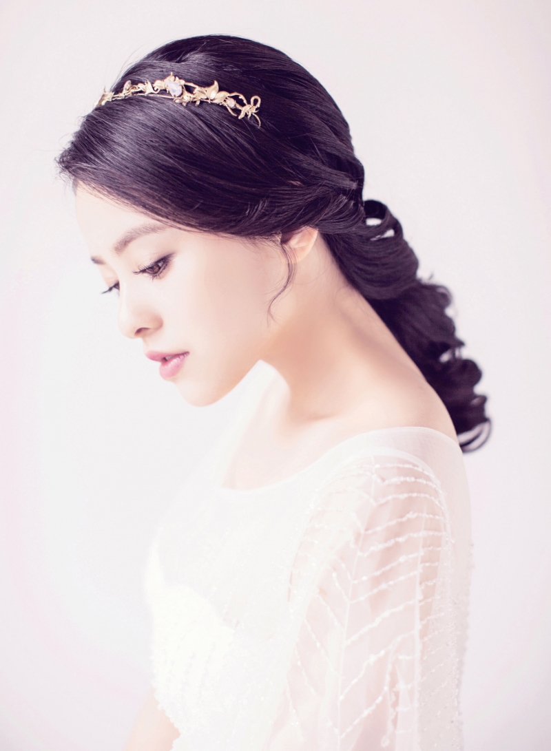 在清晨的第一縷陽光下,坐在窗前的女子要出嫁了。從女孩到人妻,這是成長的一段歷程。婚禮當天的第一款造型需要具備吸引眾人目光、讓人耳目一新的視覺效果,因而不適宜濃妝艷抹,以韓式或日式的簡約清新感示人最為合適。