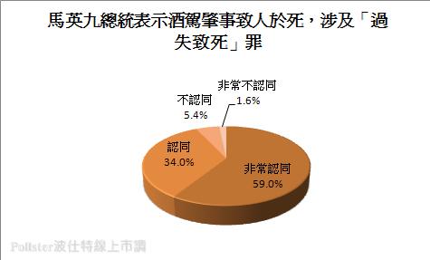 馬總統硬起來!認為酒駕肇事至人於死,涉及「過失致死」罪,有檢討之必要,對此民眾是否認同?市調結果顯示,高達9成民眾表示認同,其中59%非常認同、34%表示認同;僅不到1成不認同,其中不認同占5.4%、非常不認同占1.6%。