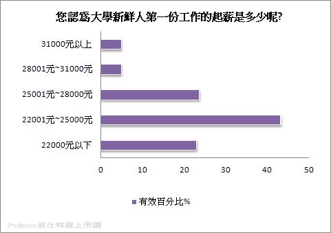 新鮮人第一份工作起薪受矚目,拿多少合理呢?22001元~25000元占43.4%、25001元~28000元占23.7%、22000元以下占23%、28001元~31000元占5%、31000元以上占5%。市調結果顯示,雖在景氣差、什麼都漲的環境下,民眾認為應給大學新鮮人首份工作的起薪,並無想像中高,恐怕與企業對八年級生的觀察有關,八年級生被認為抗壓性低、態度草率,加上缺乏社會歷練、工作經驗,影響起薪的多寡,近4成認為新鮮人應領取22K~25K的待遇,不及勞委會公布平均新鮮人起薪26K。